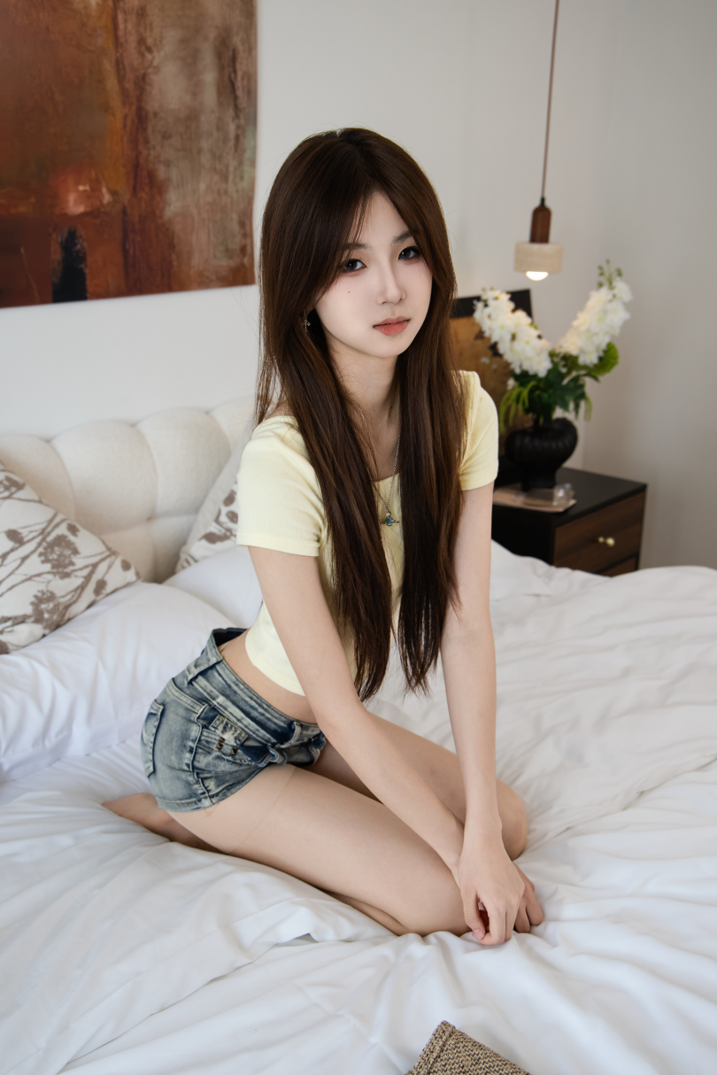 足愉心摄影第69期:模特小瑶(搭配:黄色短T、牛仔短裤、肉色丝袜、裸色高跟鞋)